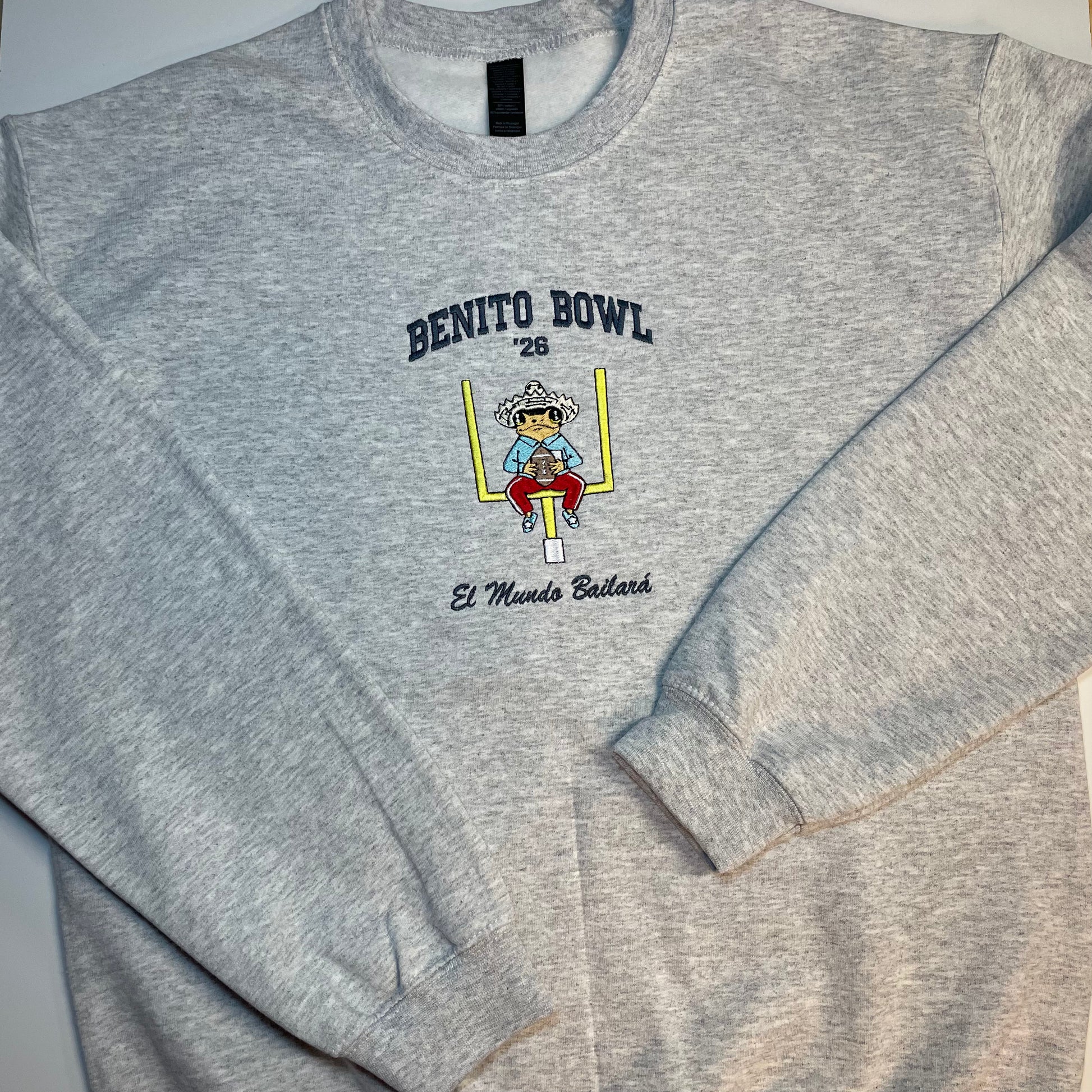 Embroidered “Benito Bowl” drawing with Sapo concho on front center of sweater.